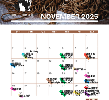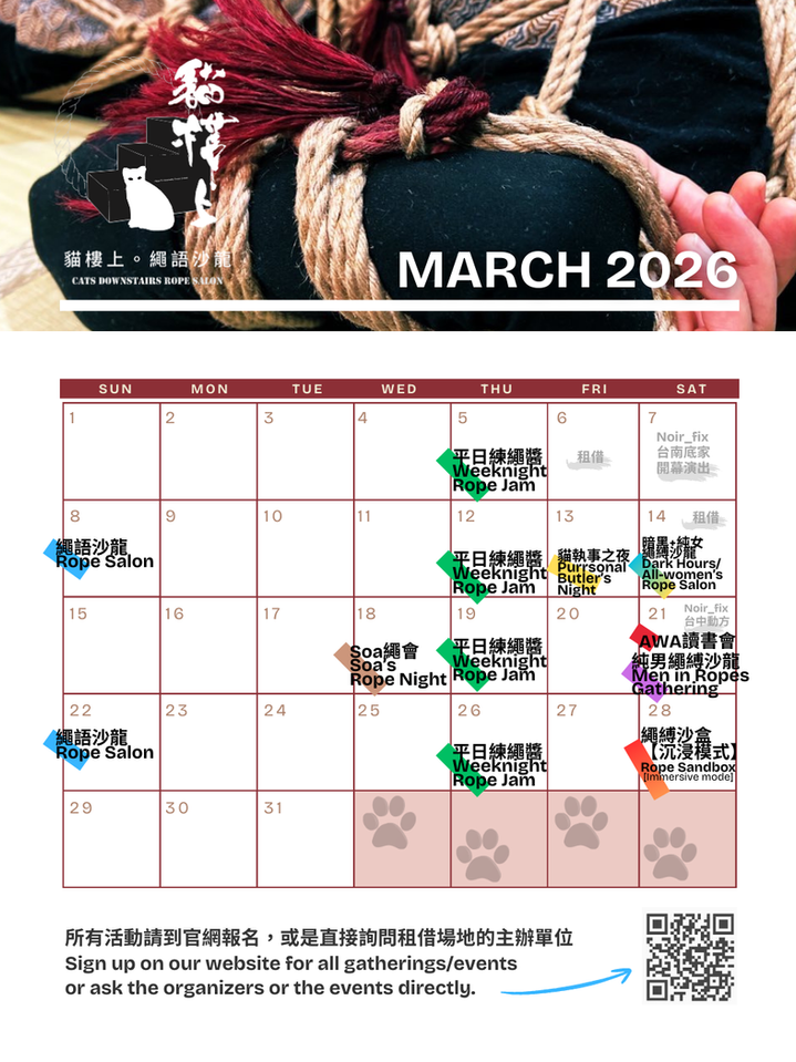 每週或每月固定:週四練繩醬、繩語沙龍(通常週日下午)、每月一次純女/純男繩縛沙龍(通常週六晚),請滑到首頁最下方週曆(可往後點選未來日期)可快速選取活動日期報名;聚會的介紹可到這裡一個個點進去查看,也可以報名有顯示的日期。