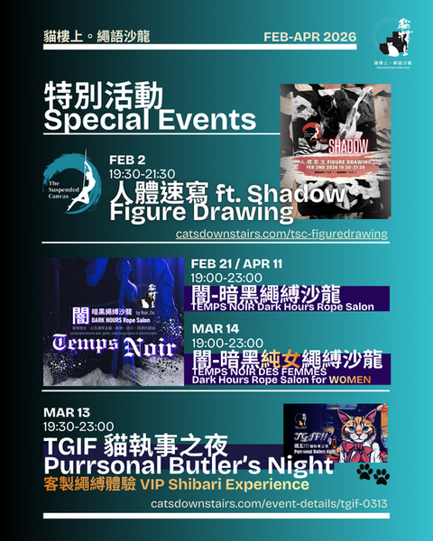 For events like Figure Drawings, Shibari Obsession (Figure Drawing with Ropes) by The Suspended Canvas (TSC), Book reading club (only Mandarin), Purrsonal Butler's Night, Performances, International workshops etc., scroll down - click the images or RSVP to see details and sign up on each of their own page. You can also see all TSC figure drawing events here.